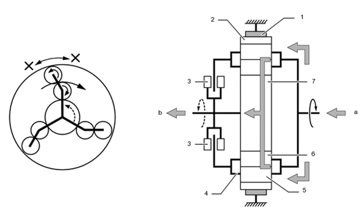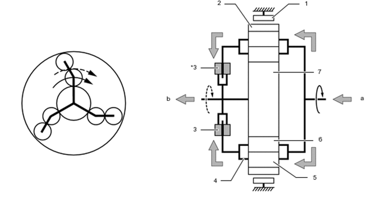 7 - engrenagem solar. a - entrada, b - saída