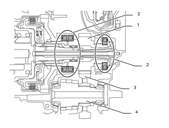 O sincronizador engata/desengata a engrenagem movida #1 e a engrenagem motriz #2. O sistema controla o eixo do garfo de mudança e o sincronizador variando a pressão do óleo. O engate/liberação do sincronizador é controlado pelo sensor de curso (posição do eixo do garfo de mudança).