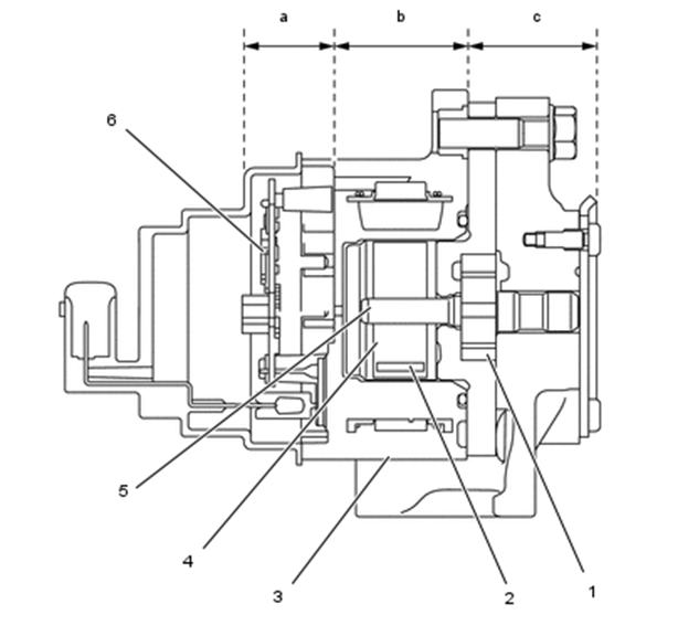 6 - acionador do motor da bomba de óleo. a - seção do acionador do motor da bomba de óleo, b - seção do motor DC sem sensor e sem escovas, c - seção da bomba de óleo.