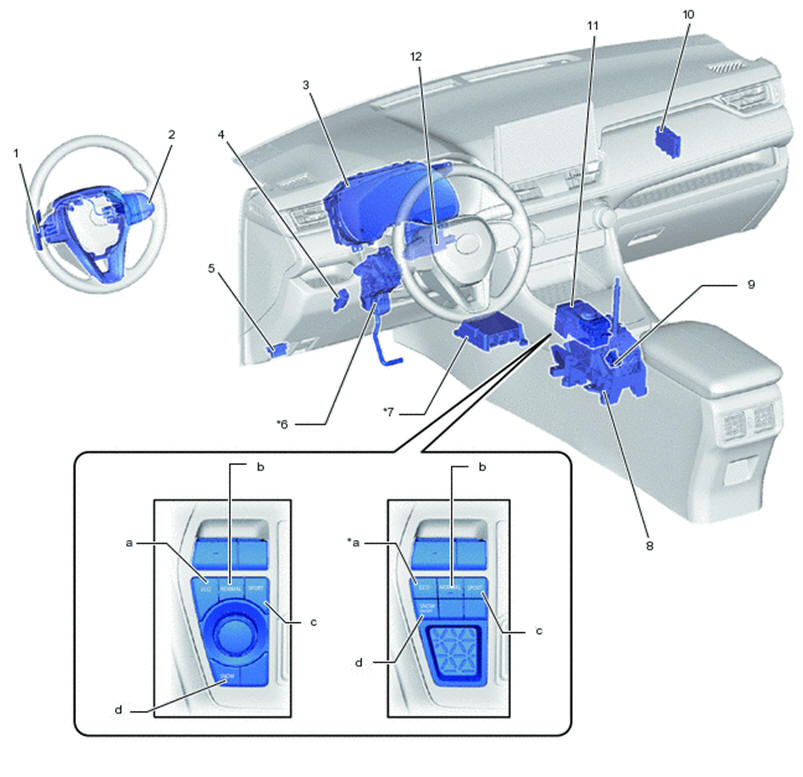 12 - amplificador A/C. a - Interruptor de modo ECO, b - Interruptor de modo normal, c - Interruptor de modo esportivo, d - Interruptor de modo neve