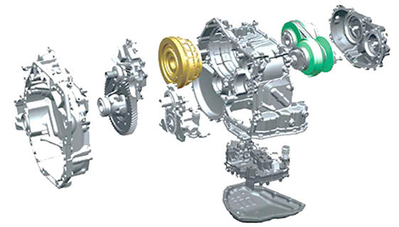 O redutor reduz a rotação da polia secundária e transmite a potência da polia secundária ao diferencial. No novo CVT, a engrenagem motriz é suportada por rolamentos de esferas em vez de rolamentos de rolos mais antigos.