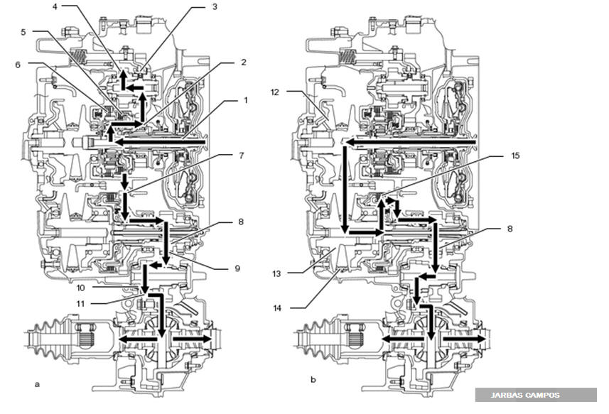 Modo de marcha: desengatar a embreagem C2, acionar a embreagem C1 ou o freio B1 (o veículo arranca, está sendo conduzido em baixas velocidades ou está em marcha à ré). A energia é transmitida da engrenagem solar através da engrenagem de acionamento #1 para o mecanismo do tipo de engrenagem e, em seguida, para o mecanismo de engrenagem de acionamento de redução através da engrenagem acionada #2.